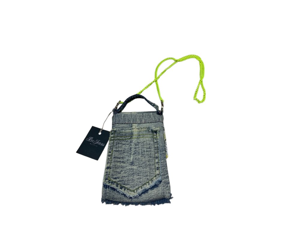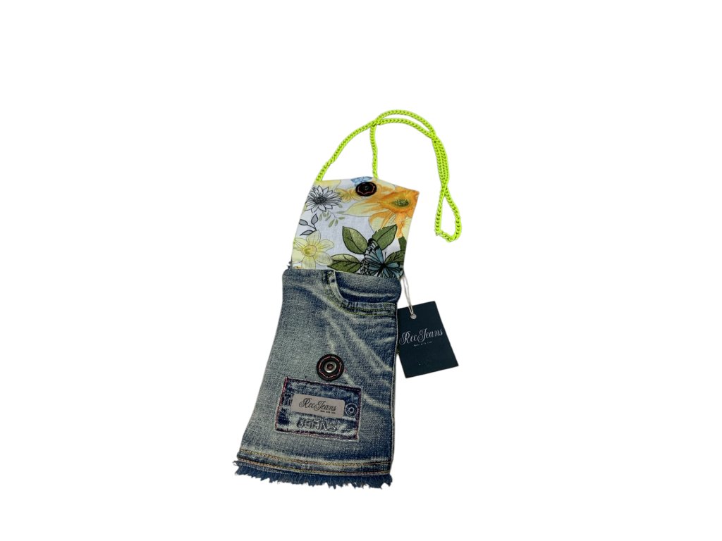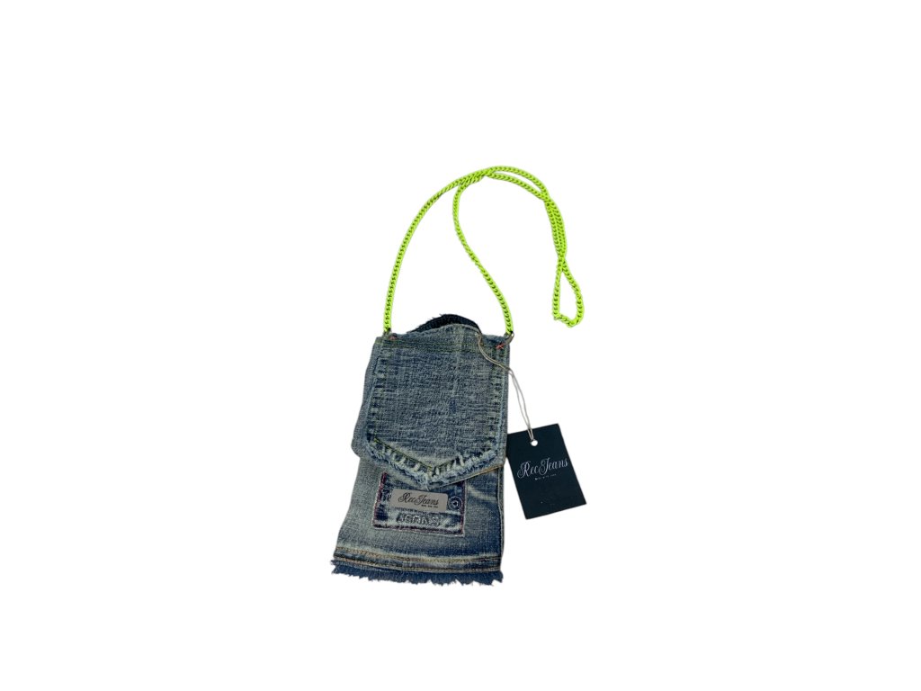 Taštička vhodná na mobil,ale vejde se do ni i malá peněženka.Má dlouhý řetízkový popruh přes rameno.vyrobena je recyklací džin