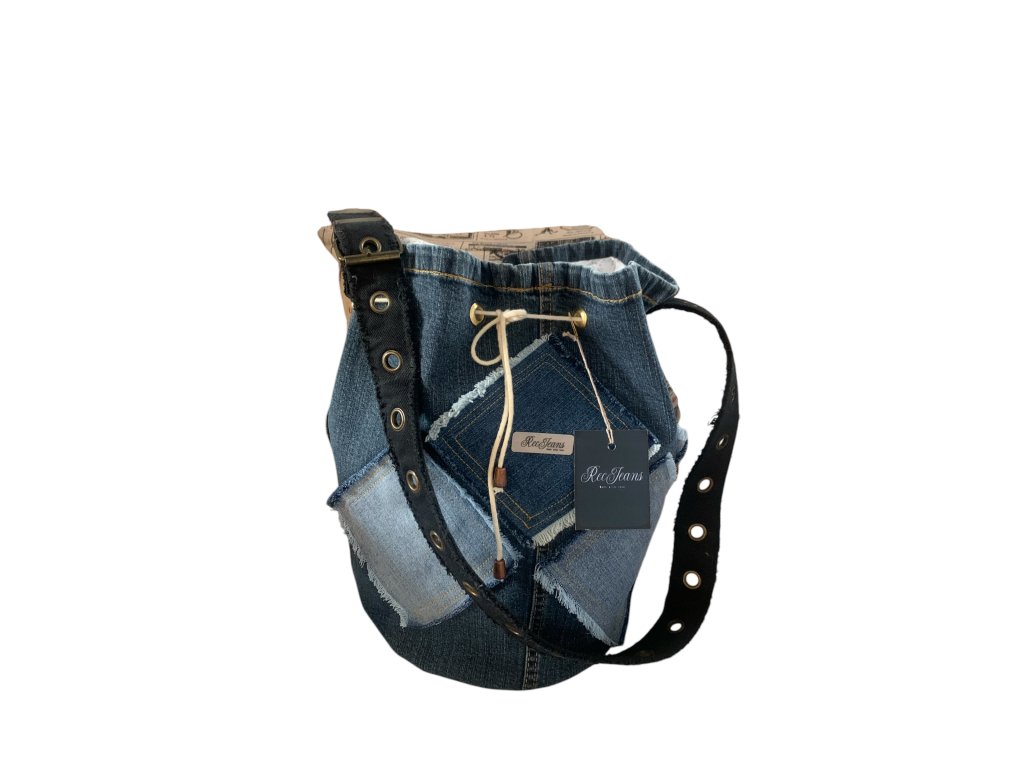 Vak je velká prostorná taška přes rameno s kulatým dnem .Zapíná se na stažení šňůrkou.Vyrobena recyklací dvou džínových sukní.