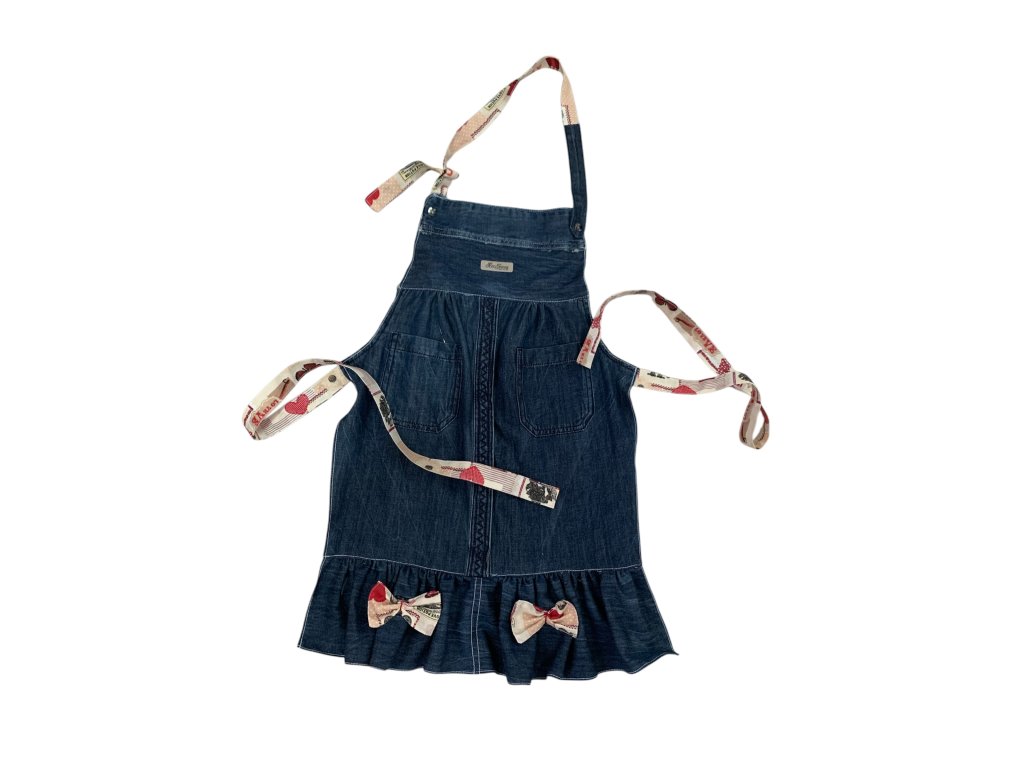Dětská zástěrka z recyklované džínoviny s úvazy ze 100% potištěné bavlny.