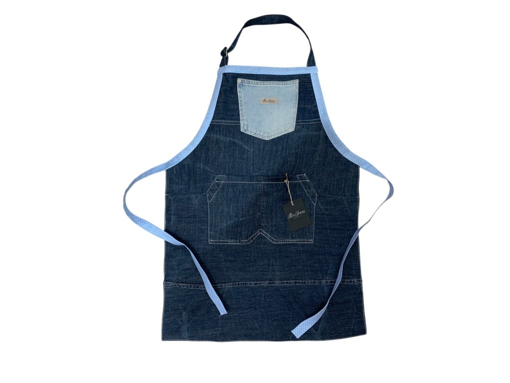 Dětská zástěra z recyklované džínoviny s úvazy z potištěné 100%banlny