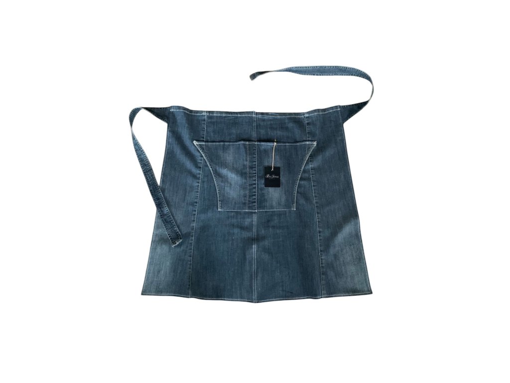 Zástěra do pasu s prostornou kapsou.Vyrobena recyklací džínové sukně.